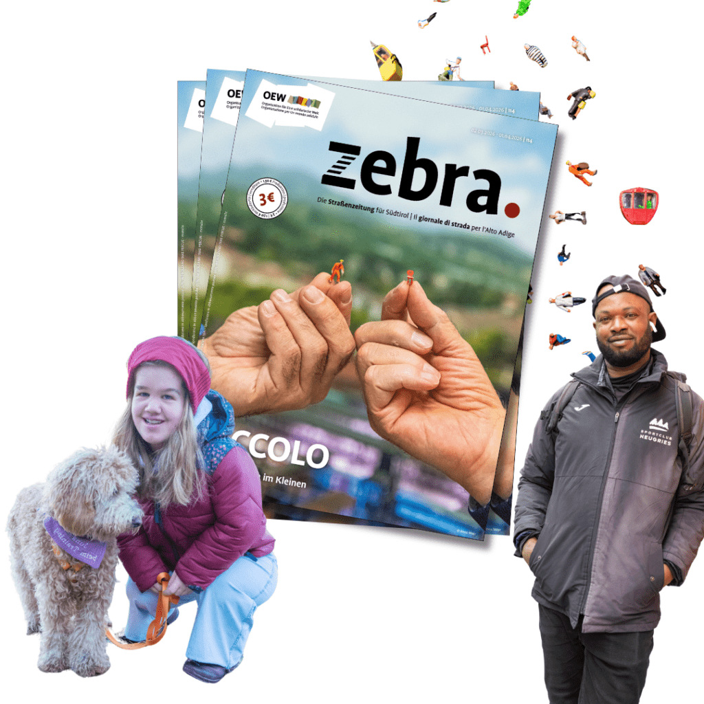 Die neue Ausgabe der Straßenzeitung zebra. kostet wie immer 3 Euro und ist überall in Südtirol bei unseren registrierten zebra.Verkäufer*innen erhältlich.
